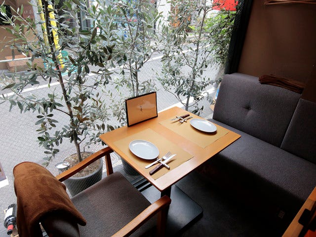 店内は手前にゆったりとしたテーブル席を設置。また奥には料理を作るオーナーシェフ・中村鉄平さんの様子が見えるカウンター席があり、ワインと前菜でくつろぐおひとり様でも利用できる。