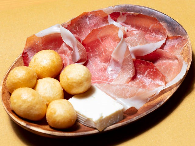 強力粉と水、イーストでまとめるパン生地「コッコリ」を、オリーブオイルと菜種油をブレンドした油でこんがり揚げ、切りたての生ハム、酸味さわやかなクリームチーズ「ストラッキーノ」と盛り合わせる一皿だ。
