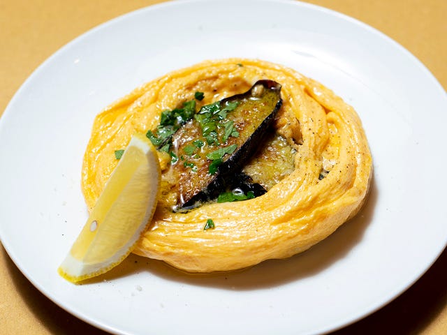 メニューの筆頭にあり、オーダー率はなんと100%! おすすめコースにも必ず組み込まれる一皿だ。ソテーしたナスを使う、とても珍しいターバン状のオムレツだが、中村シェフがフィレンツェのレストランで出逢った一品なのだとか。