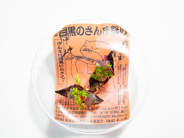 まず前菜として提供されたのは、ガラスの繊細な器。そしてその中に敷かれているのは、なんと“目黒のさんま”のチラシ!