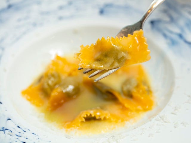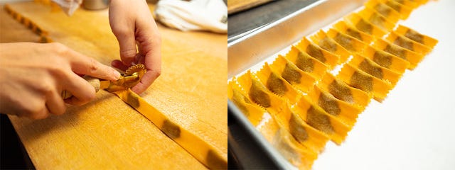 手作りした卵入りのパスタ生地の目を細かく刻むように肉ダネを置き、上にパスタ生地を重ねてカットするのだが、実はこの小さな四角の中には、牛肉、豚肉、うさぎ肉、米、ホウレン草、ちりめんキャベツ、玉ネギ、イタリアンサルシッチャソーセージ、パルミジャーノチーズ、生クリーム、そしてビネガーにハーブ類などなど、驚くほど数多くの食材を煮込み、それを滑らかなペースト状にしたものが入っている。