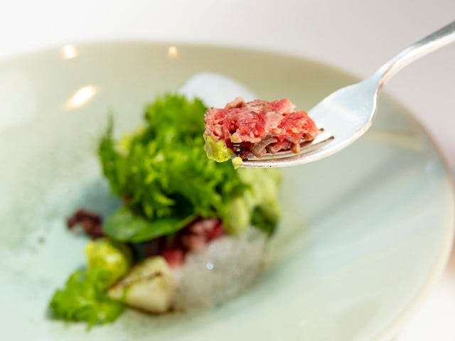 メイン食材として使うことの多いイメージのある牛肉だが、なんでもこの料理に使うアイルランド産のへアフォード牛は、赤身のおいしさに定評がある。また脂が少なくさっぱりとした後味のため、牛肉をシンプルに味わうタルタルに適しているという。