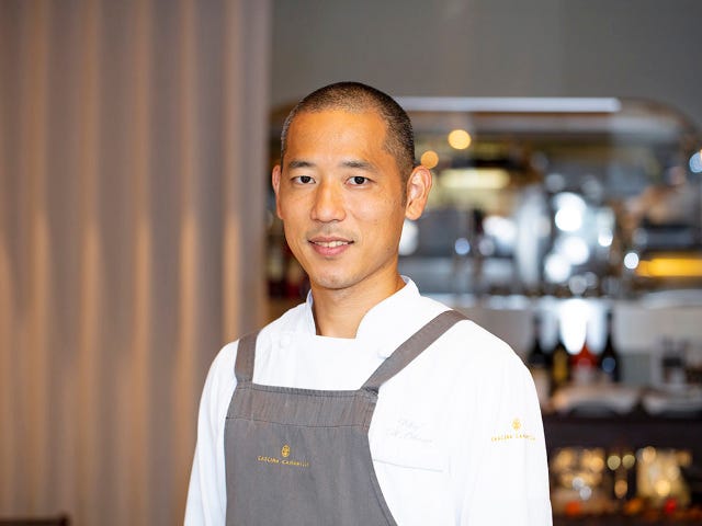 食通も足繫く通うこちらで腕を振るうのは、三軒茶屋の人気店『ペペロッソ』や銀座『トラットリア・バッフォ』、トリノの星付きリストランテ『ラ バリック』ではセコンドシェフまで務めた超実力派シェフの岡野健介さん(写真下)。