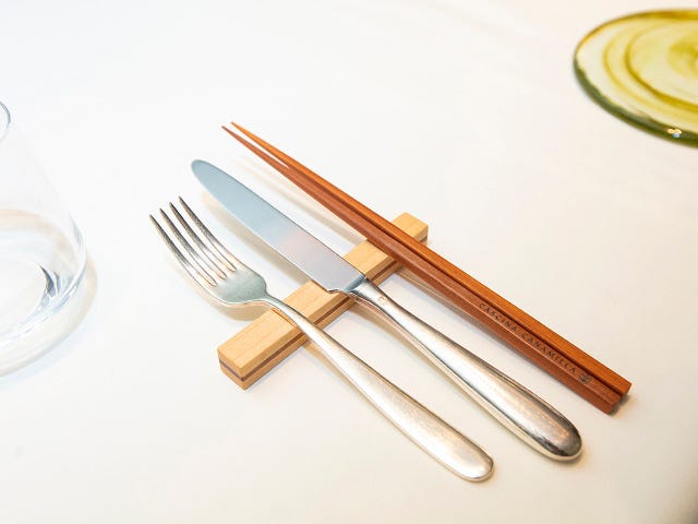 エレガントな雰囲気が漂う『リストランテ カシーナ カナミッラ』だが、実はナイフやフォークとともに提供しているのが、「目黒川の桜並木」をイメージさせる、桜の木を使ったお箸。