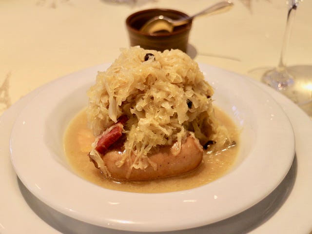 素朴な煮込み料理シュークルートはアルザス地方の郷土料理で、ワインのセレクトとぴったりつながる。お皿を前にのどかな田舎町の風景が浮かびそうだ。