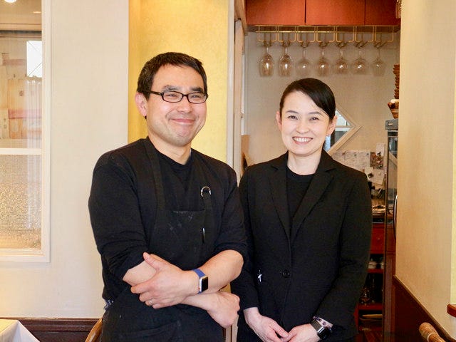 忙しいランチタイムが終わって、ほっとひと息のオーナーシェフ花澤龍さんと、マダムのめぐみさん。仲良く二人三脚で営み、もうすぐ20年に手が届く。