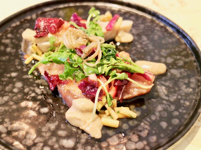 ほかに、フルーツトマト、ラディッシュのスプラウト、トレビス、山エノキなど、それぞれが深みある味を主張していて、まさに春爛漫。ブラウンのキノコソースをアクセントにしながら、味の変化を感じたい。