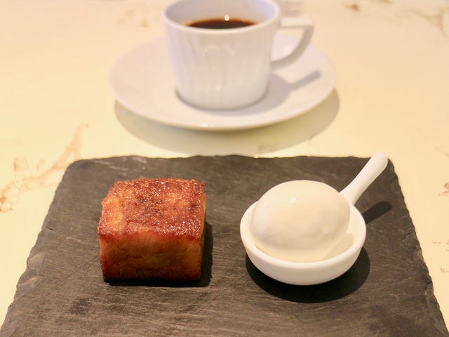 ブランデーがしみた大人のバナナケーキと、塩が隠し味の牛乳シャーベットの2種盛りで、濃厚さと塩のさっぱり風味、交互に口に運びたい。飲み物は、コーヒーのほか、紅茶やハーブティーも用意する。