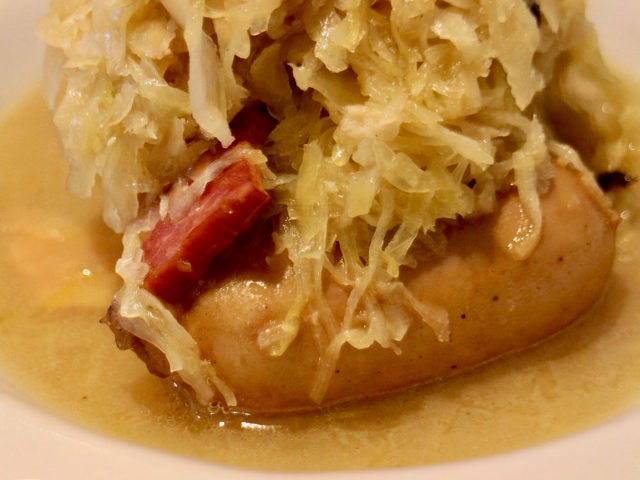 乳酸菌による発酵の酸味がアクセントのシュークルートと自家製フランクフルト、ほろほろで肉肉しい塩豚が煮込まれている。