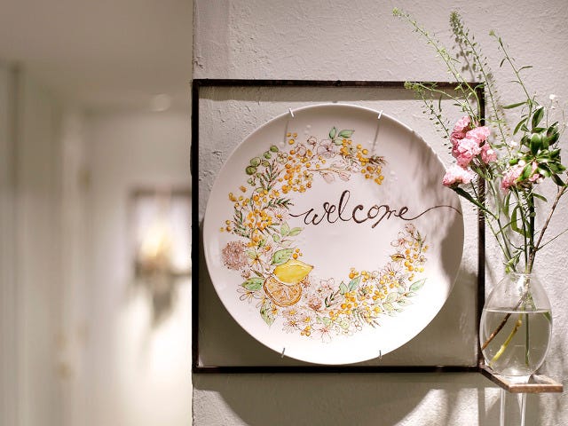 チャーミングな紫色の扉を開けると目に飛び込んでくるのは、色とりどりの草花や果物が描かれ「welcome」という文字が記された白いプレート。