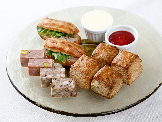 パテは奥左側のピンク色のほうが「信濃地鶏のパテドカンパーニュ」で、手前右側が「黒豚のパテドカンパーニュ」。そしてバケットのように見えるのが「ポークリエットのシュー・サレ」で、生地のエクレア部分にはナツメグや黒胡椒、チーズを入れてワインに合うよう焼き上げている。