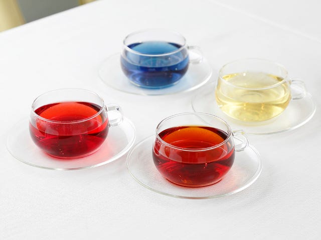 フリーフローとなるティーやハーブティーは、独自のブレンドに定評がある紅茶卸の『葉楽』のものを使用。早摘みの「ダージリンティー」や定番の「アールグレイ」はもちろん、カカオニブを配合したチョコレートの香りがする「グリュエ・ド・ショコラ」や、レモンを加えると青色から紫色へと変化するバタフライピーを使った「ピュアブルーマジックティー」など、彩り鮮やかなドリンクを取り揃えている。