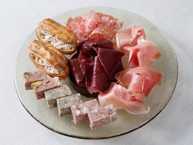 「ポークリエットのシュー・サレ」「黒豚のパテドカンパーニュ」「信濃地鶏のパテドカンパーニュ」に加え、豚肉を使った「ブルーチーズのパテ」に、生ハムの「ハモンセラーノ」、イタリア産の「ブレザオラ」と呼ばれる牛肉の生ハム、イタリア産「ミラノサラミ」と盛りだくさんだ。