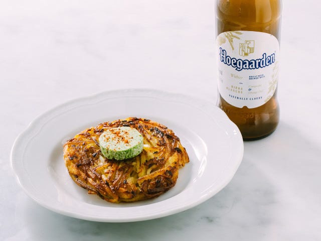 近年日本でもファンを増やし続ける北イタリア、フリウリ地方を代表する料理のひとつだ。田淵シェフが修業したフリウリは、ドイツに近い地域でビールが安かったため、休日になると仲間たちと作ったという思い出の味だ。ジャガイモにチーズという鉄板コンビで作られた、北イタリア風ジャガイモのおやき。乗せられたアオサのバターが清涼感を呼ぶ。まさにビールのために存在するかのような「フリコ」と、「ヒューガルデン」の爽やかさが無限のループを生み出していく。