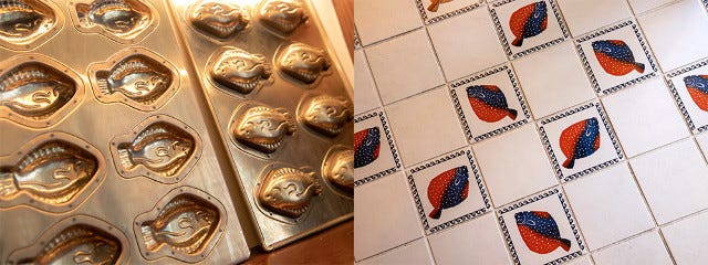 金型のデザインがなぜカレイかというと、前述した『エルカノ』の名物料理が「イシガレイの炭火焼」だから。店内の床などにもカレイを発見できるほか、内装デザインは、『エルカノ』が立地する港町・ゲタリアにちなんで、船内を思わせるデザインに仕立てている。