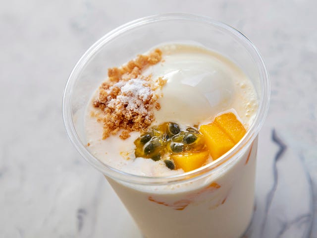 ちなみに、トッピングなしのベーシックなバージョンは年間通して提供しているが、鮮やかな彩りを目でも楽しみたいなら、季節ごとに変わるフルーツをトッピングしたタイプをぜひ。夏季限定の、宮崎県産マンゴー×パッションフルーツトッピングは夏らしさいっぱい。サクサクのクランブルと一緒に口に運ぶと食感の変化もまた楽しい。