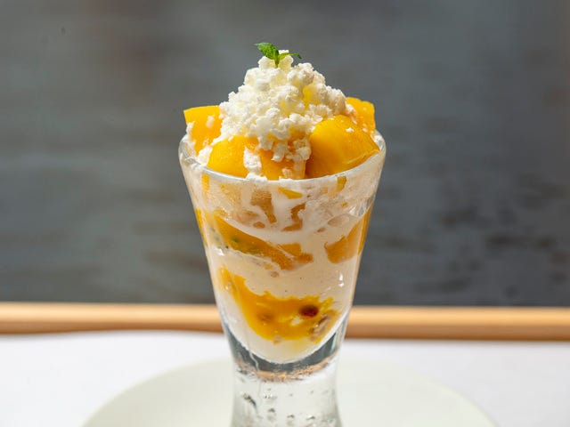 「マンゴーとココナッツのパフェ」(写真上)は、ココナッツのグラニテやゼリーとマンゴー、パッションフルーツなどのサマーフルーツを合わせたパフェ。