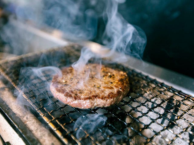 和牛100%のパティは粗めのミンチでワイルドに。このパティを鉄板で焼いてから、炭でスモーキーな香りをつけている。