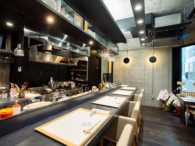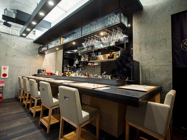 こだわりはカウンターの高さ。シェフと目線を交わして会話が楽しめるように絶妙な高さになっている。椅子も座りやすく、かつリラックスできるように片側だけひじ掛けのついたスタイル。一人で来店してもリラックスして過ごせそうだ。