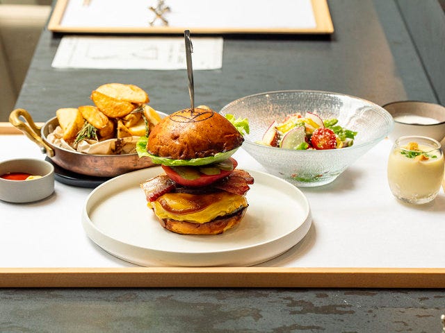 『モノビス』の「ハンバーグ・ロッシーニ」は、脂身と赤身のバランスがよい和牛のイチボ肉を使ったハンバーグに、厚みのあるフォアグラを乗せ、香り豊かなトリュフとマデラ酒のソースをたっぷりかけた心もお腹もリッチになる料理。『モノリス』と同じクオリティの和牛を惜しげもなく使ったハンバーグは肉の味の濃さにまるでフィレ肉を食べているよう。