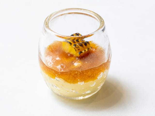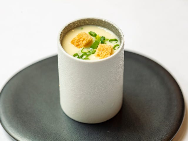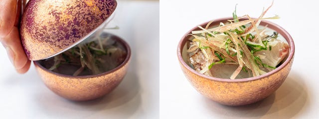 ポロネギとジャガイモの冷製スープ「ビシソワーズ」(写真上)。中には、温泉卵の卵黄とエビがゴロッと入っている。シンプルにジャガイモのピュレを牛乳でのばしたスープは、卵黄を混ぜながらいただけば、コクのあるスープに変身。こんな小さな器にも楽しい仕掛けがある。