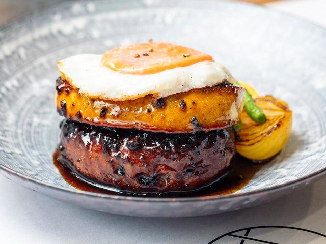 この贅沢なハンバーグの上にトッピングしているのが目玉焼き。なぜ目玉焼き?と尋ねると、「目玉焼きを乗せるのが好きなんです。フォアグラとトリュフと卵は相性がいいですしね」と石井シェフの茶目っ気のある答え。フランス料理ならできないことも『モノビス』ならできる。