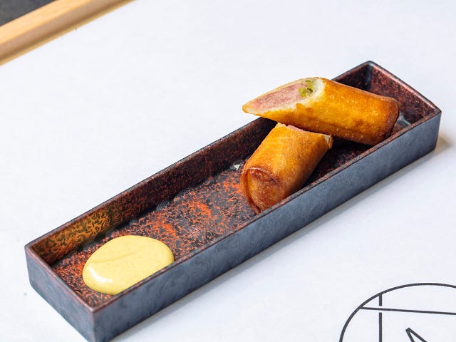 最後に登場するのが「パテ・ド・カンパーニュの春巻 マスタードソース」(写真上)。脂身と肉の味わいのバランスがいい豚のノド肉を使ったパテ・ド・カンパーニュは『モノリス』でも大好評の一品。