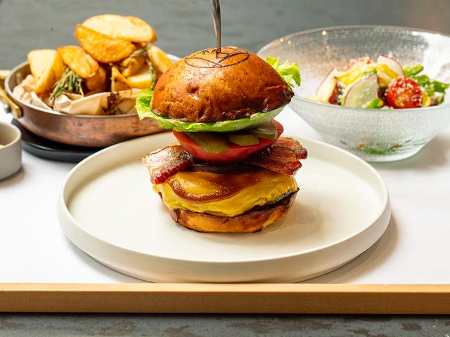 挟んでいるのは、トロットロのレッドチェターとゴーダチーズの2種類のチーズ、ローストした紫タマネギ、ジューシーなベーコン、トマト、ピクルス、レタスなど。最後まで肉の味わいを感じられるように層を工夫したのだとか。