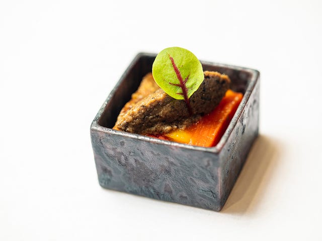このうまみがギュッと凝縮したシマアジに合わせるのは、ナスにアンチョビ、ニンニクなどを加えてペースト状にしたナスのキャビア仕立てと、石川県産いしるを加えた大葉のジェノベーゼ風ソース。小さな器の中に詰まった味わいの奥深さをゆっくりと楽しみたい。