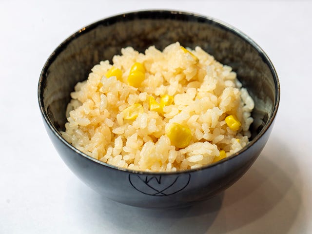 本日は「トウモロコシご飯 バターライス」(写真上)。バターの風味が香り、コーンの甘さが染みたバターライスと、肉汁たっぷりのハンバーグは最強の組み合わせ。フランス料理と和定食両方の幸せを噛みしめる瞬間だ。