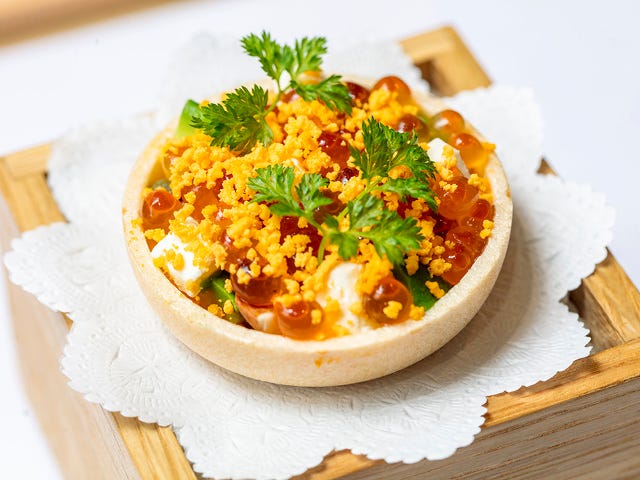 最中をカナッペに見立てた「スモークサーモンとクリームチーズの最中」(写真上)。パリッとした皮の中にあるのは、スモークサーモン、クリームチーズ、イクラ、アボカド、アーモンドなど。余計な味付けは一切なく、素材同士の味の組み合わせを楽しもう。食感のアクセントになっているのはカリカリとしたアーモンド。見ても食べても楽しい一品だ。
