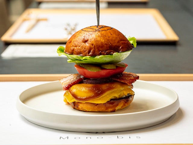 紹介したいのは「モノビス・バーガー御膳」(写真上)。フランスパンの粉で作ったバンズは、フワッとしたふくらみがありつつもハードな食感。バターで焼いて脂の層をつけてから具材を挟むため、最後までパリッと感が楽しめる。