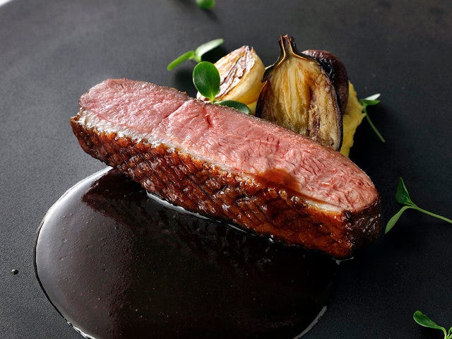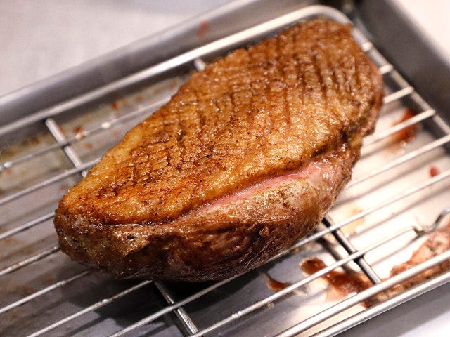 「プレジール」のアントレでは、「シャラン鴨のロースト 12種類のスパイスのラケ」(写真下)を提供。鴨の胸肉を使用し、肉の繊維を見て大きくカットする手法は、近代のフランス料理で使われる技法なのだとか。このカットにより、肉のジューシー感が増すという。
