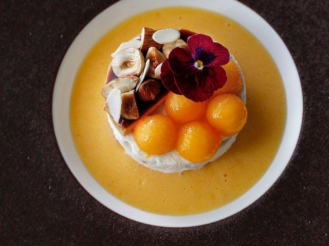 こちらは、ランチコースのデセールより、秋の季節を見た目や食材で表現した「ヌガーグラッセ 柿のスープ」(写真下)。