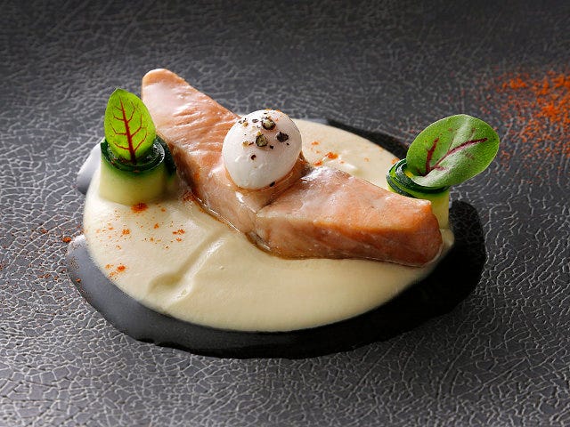 秋鮭はコンフィすることでホロホロと溶ける食感に。さらに低温でじっくりと火を通すことで、秋鮭のうまみがぎゅっと凝縮されている。