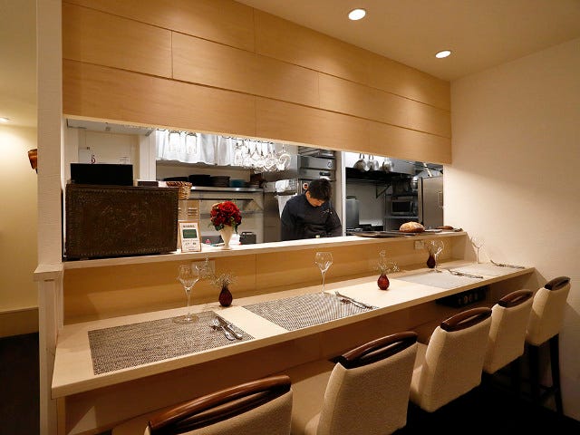シンプルでクラシックな外観は敷居の高さを感じさせず、誰でも気軽に利用できる雰囲気。ディナーコースは要予約だが、ディナーでもカウンター席での食事やランチは予約なしで利用することができる。