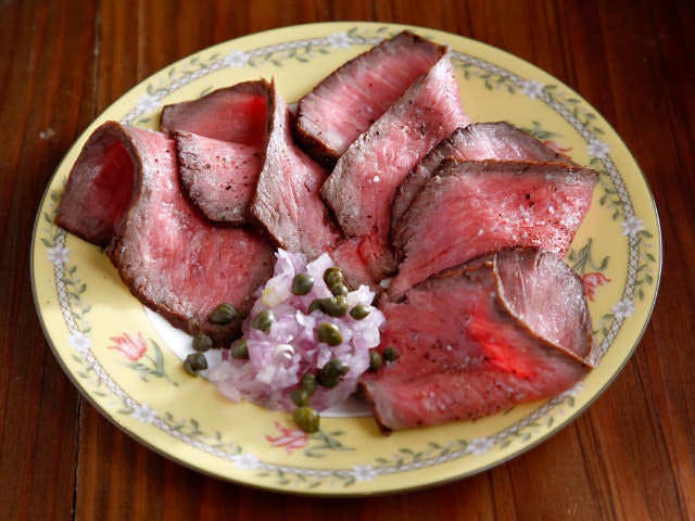料理に関してのこだわりは、日本各地の生産者から直接取り寄せた食材を使うこと。たとえば、「ローストビーフ」(写真上)には、佐賀県白石町で独自の飼育プログラムで育てられている「しろいし牛」を使用。ストレスフリーで育った牛のジューシーな赤身は、2時間かけてじっくり火を通すことで最大限にうまみを引き出している。