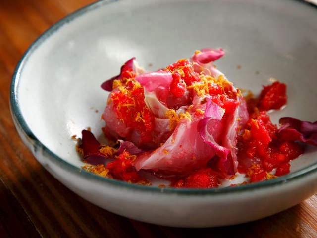 紅芯大根にレモンやライム、赤ワインビネガーを加え、イタリアの魚醤“コラトゥーラ”を合わせた「メバルのセビーチェ」(写真上)は、見た目の華やかさも圧巻。合わせる魚は、その日入ってきた魚からもっとも相性のいいものを選んでいる。