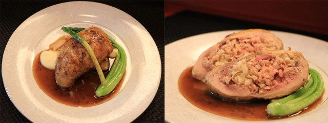 続いては、スペルト小麦とキャベツのリゾット、そしてフォアグラが詰められた「詰め物をしたホロホロ鳥モモ肉のロースト」(写真上)。マデラ酒とフォンドボー、肉を焼いたときに出る焼き汁などを加えたソースを絡めると、うっとりさせられるほど芳醇な味わいだ。