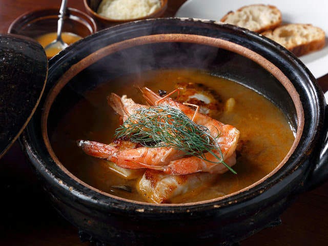 人気メニューのひとつ「トウキョウブイヤベース」(写真上)には、新鮮な魚介をふんだんに使用。