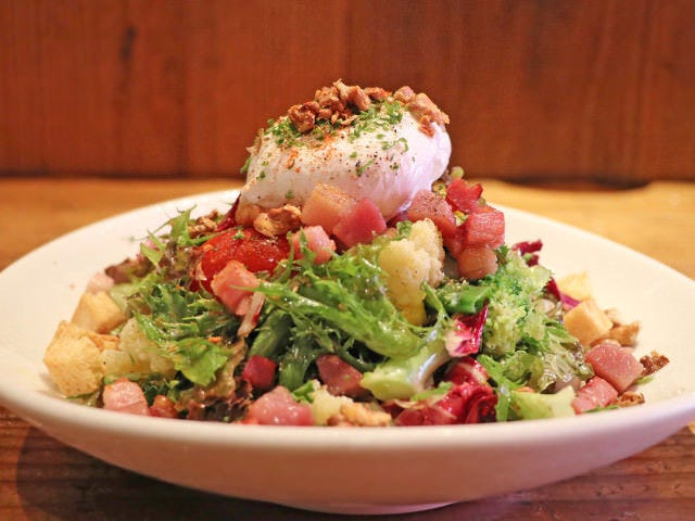 なかでも、『もしもし下北沢』にも登場した「ポーチドエッグの入ったリヨン風サラダ」(写真上)はカラフルだが、「野菜が大好きだからついついたくさん使ってしまう」という吉澤さんの言葉通り、10種類前後の旬野菜が盛られている。