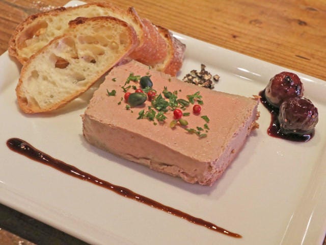 ワインにぴったりの「鶏白レバーのテリーヌ」(写真上)は、なめらかでねっとりとした質感が特徴的。しっかりと塩味がきいているから、ワインがどんどん進んでしまう。