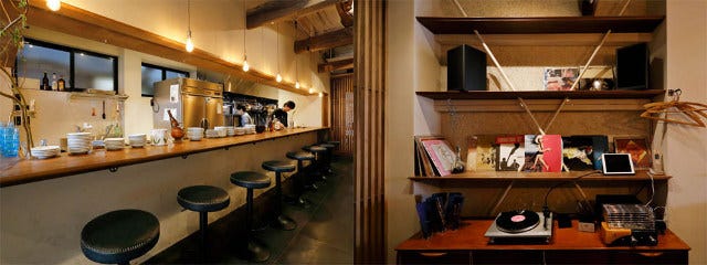 カウンターの設えや、本やオーディオ装置が並べられたインテリアもステキ。「こんな家に住みたい!」と妄想しながら食事を楽しめそう。