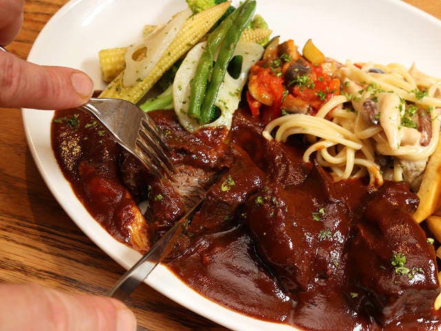 こちらは「牛ホホ肉の赤ワイン煮込み」(写真上)。2時間半かけてじっくり煮込まれたホホ肉は、ナイフを入れるとホロッと崩れるやわらかさ。野菜とパスタもたっぷりなので、前菜を頼まずこれ一品でディナーを満喫する人も多いそう。