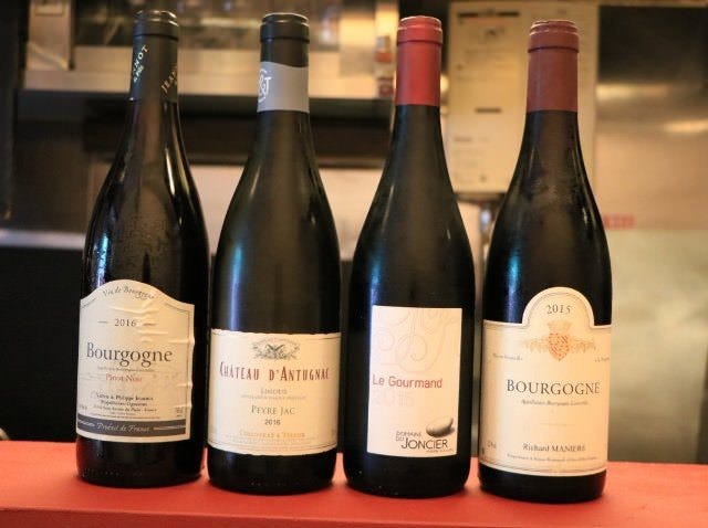 ワインは、ブルゴーニュなどフランスワインを中心にオンリスト。グラスワインは常時5~6種類用意があるので、料理とあわせていろいろ試してみて。