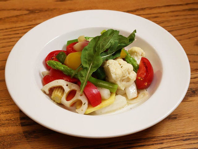 さっぱりといただける一品をお探しなら、「冷製ギリシャ風野菜の蒸し煮」(写真上)はいかが? 絶妙な火入れによって生野菜のようにシャキシャキした食感が保たれた野菜は、ほんのり酸味がきいていて、ワインできゅっと流し込むと最高の気分。