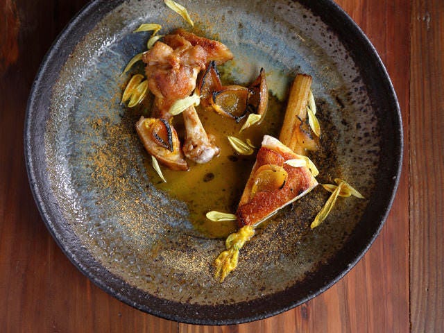 熊本県天草にある「蓮池(はすいけ)養鶏場」から一羽丸のまま届けられるブランド鶏「天草大王」を使った「天草大王(鶏)のロースト -カナリア-」(写真上)は、パリでの修業時代、同僚のセネガル人から教わったアフリカ料理「プレヤッサ」という鶏のレモンシチューを光安シェフ流に再構築したもの。日本で最大級の大きさという「天草大王」の、ジューシーな食感を堪能できる。
