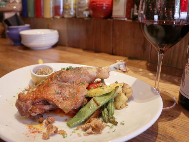 おいしい肉料理をみんなでシェアしたいなら、「シャラン産鴨肉のコンフィ」(写真上)はいかが? 軽く塩漬けした後、低温でじっくりと火を通した鴨肉は、パリパリとした皮と芳醇な身のコントラストが心地よい。